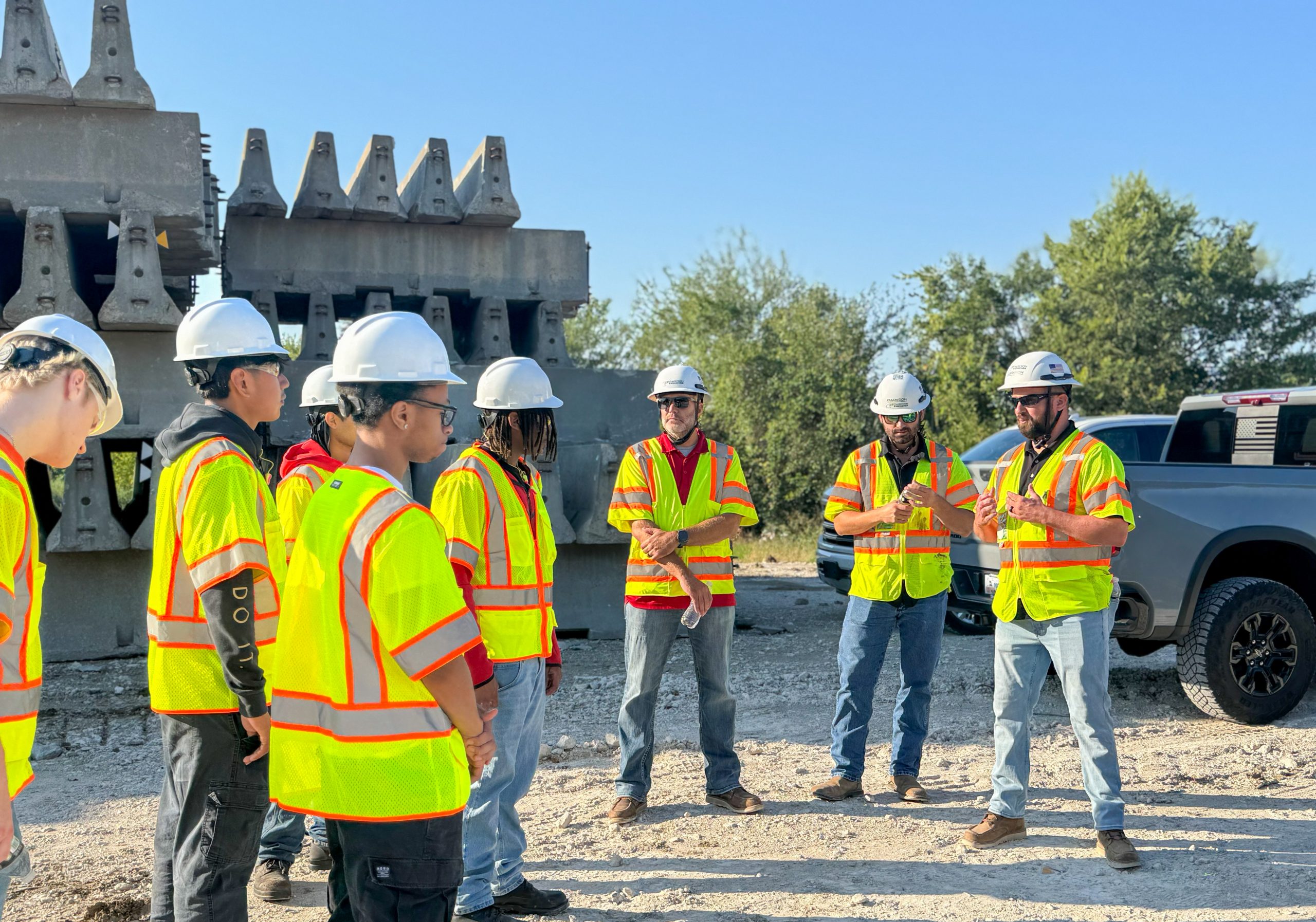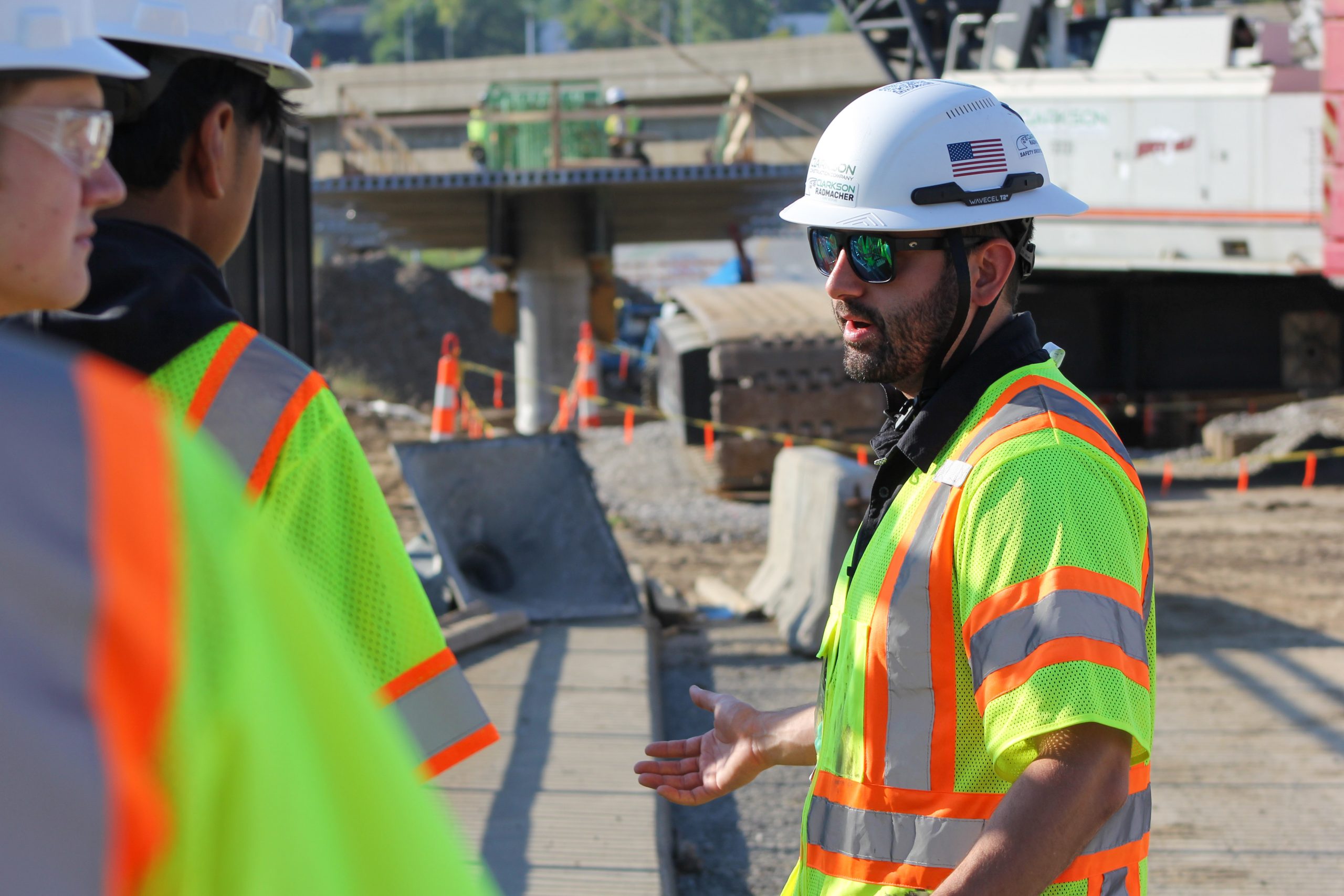 Students suited up with PPE and participated in a safety briefing before heading out to the Benton Curve to see construction in action. During the visit, they heard directly from team members about how they get started in the construction industry and what it takes to build a project of this size and complexity.